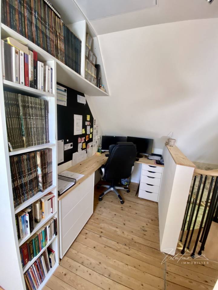 Un escalier en colimaçon vous mène à l’étage mansardé, où un palier accueille un coin bureau puis dessert deux chambres supplémentaires et une salle de douche avec toilettes.