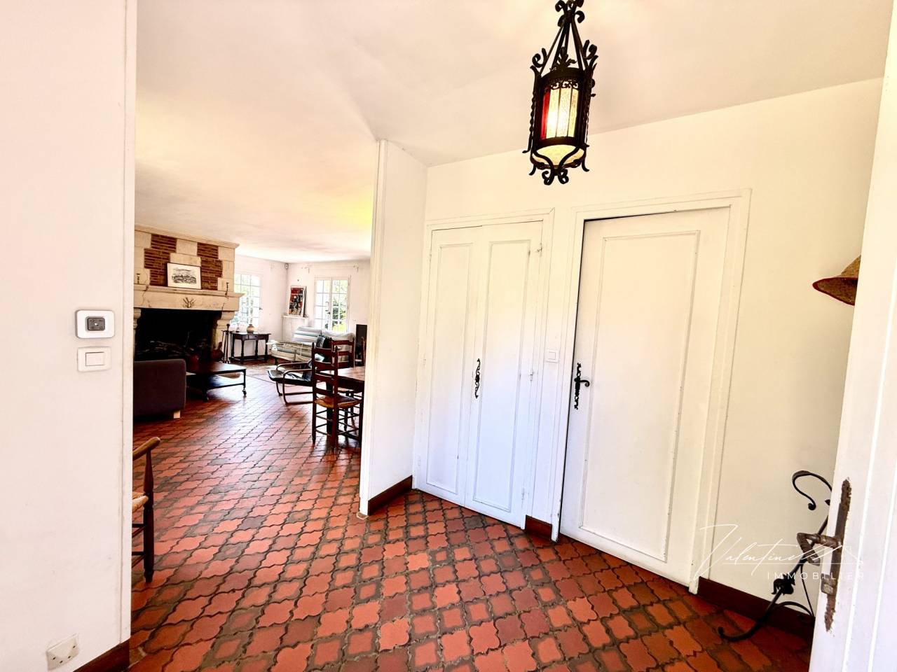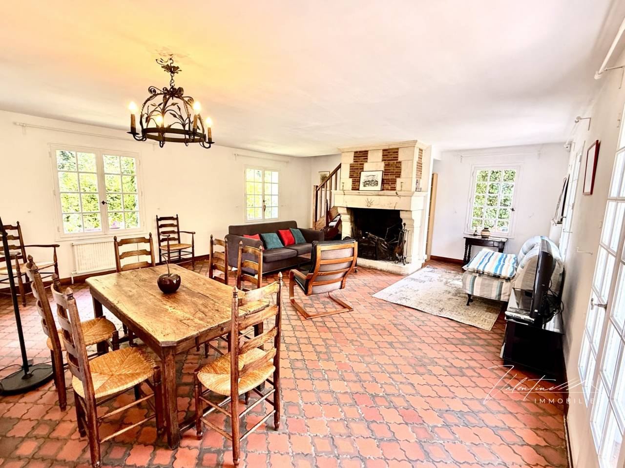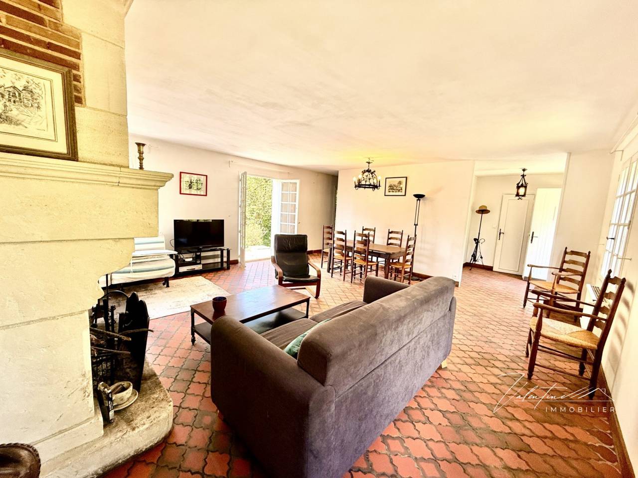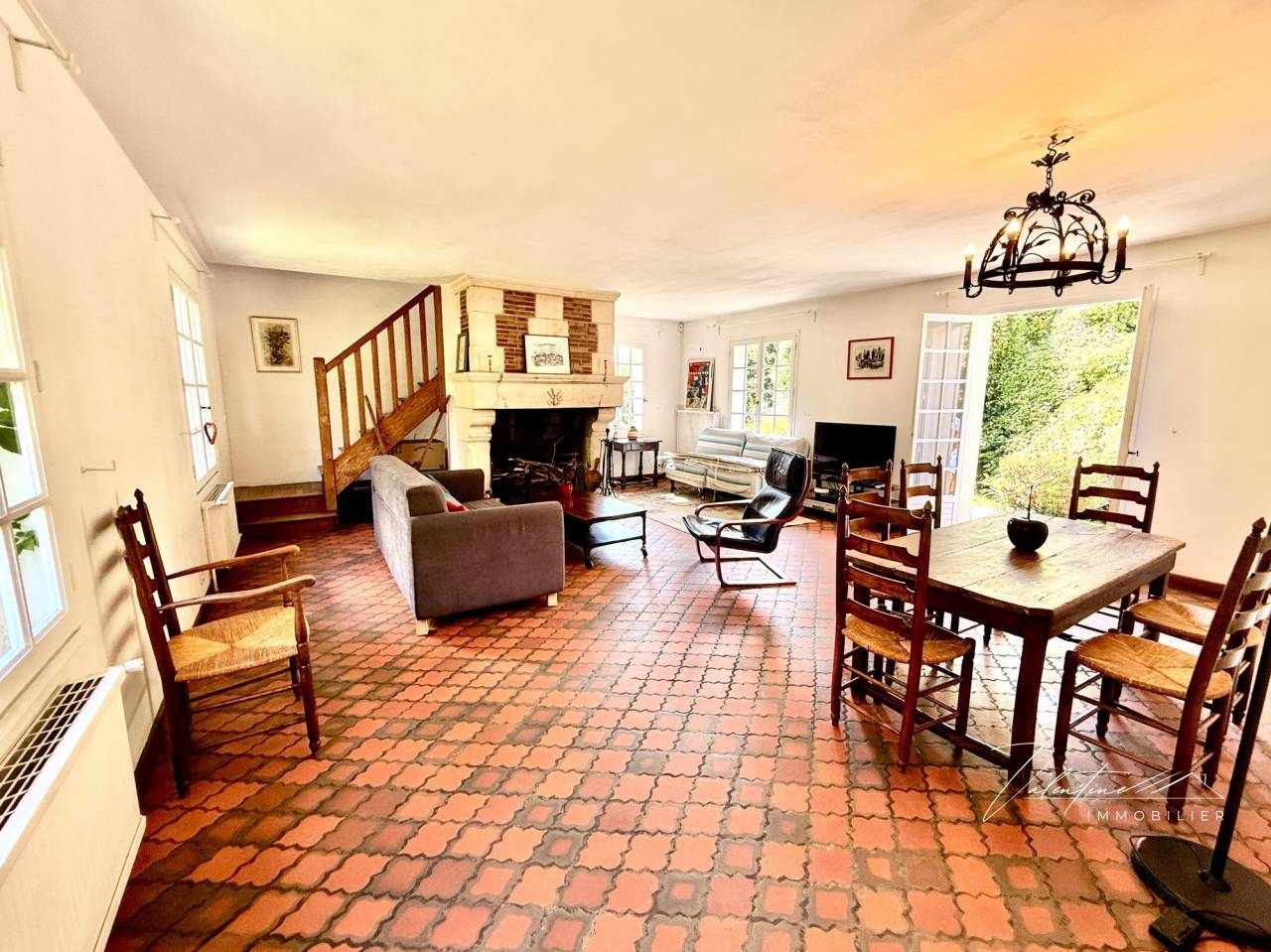 Au rez-de-chaussée, l’entrée avec rangements mène à un vaste séjour traversant d’environ 40 m². Son ambiance chaleureuse est soulignée par une belle cheminée et des tomettes au sol. Il s’ouvre sur une terrasse exposée plein sud, parfaite pour profiter du soleil. Une cuisine aménagée et équipée, ainsi que des toilettes invités, complètent ce niveau.