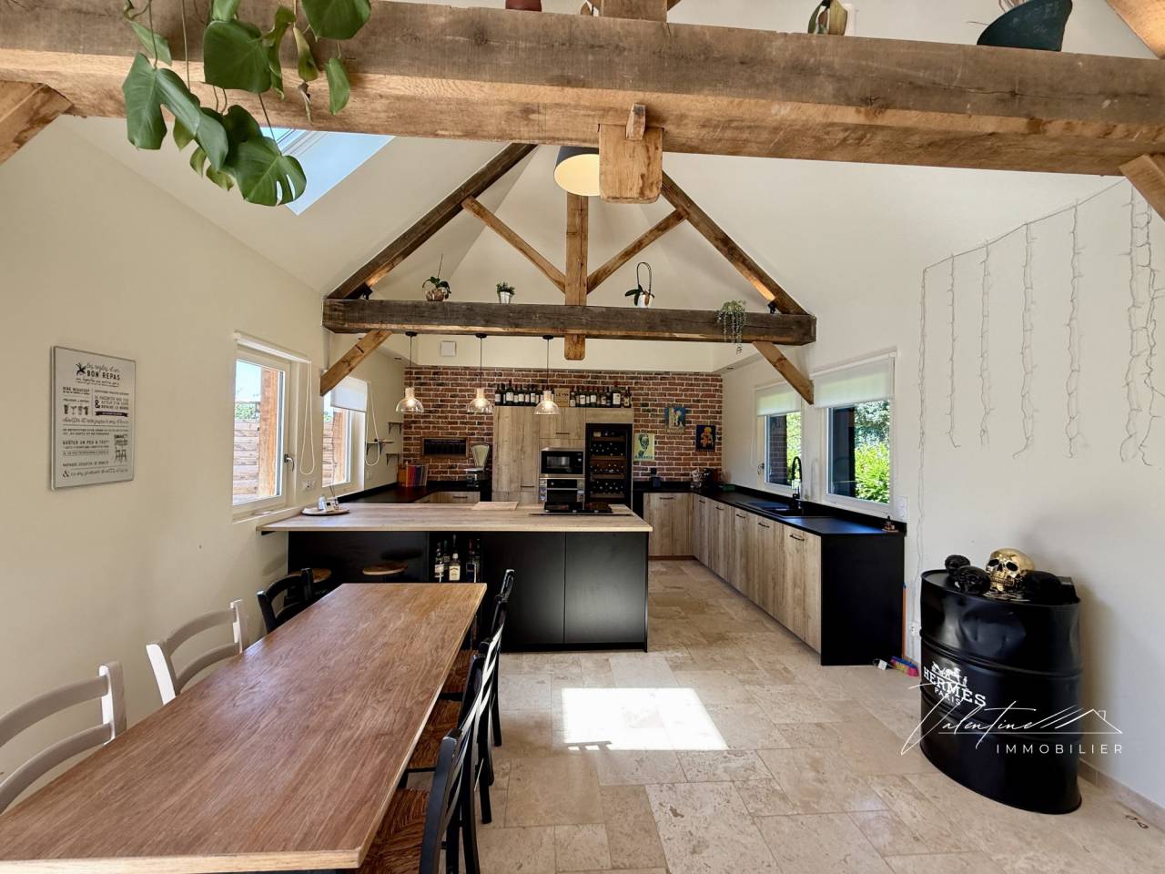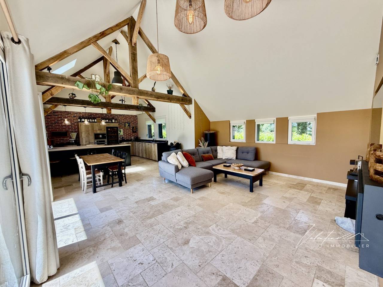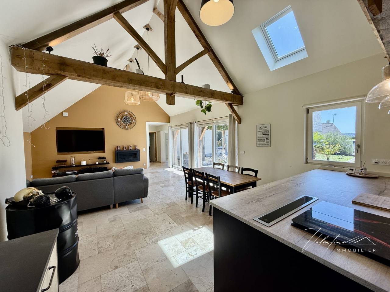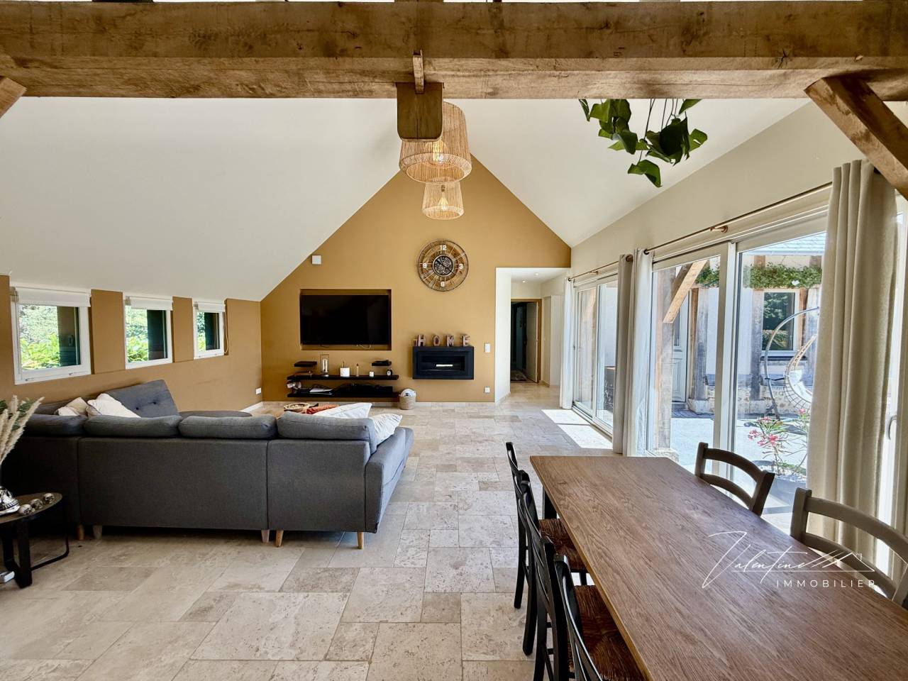 Cette maison offre un cadre de vie agréable. Dès l’entrée, vous serez séduit par une grande pièce de vie lumineuse, baignée de soleil grâce à de vastes baies vitrées orientées plein sud. Son authentique style architectural normand, rehaussé par une magnifique hauteur sous plafond et de superbes poutres apparentes dans le séjour, dégage un cachet unique, complété par une décoration moderne et chaleureuse. La cuisine ouverte, entièrement aménagée et équipée, est conçue pour un confort moderne au quotidien. L’agencement comprend également une buanderie et quatre chambres. Parmi elles, une spacieuse suite parentale de 27m², dotée d’une salle de douche à l’italienne, d’un dressing et de WC. Un couloir dessert, les chambres, des WC séparés et une salle de bains supplémentaire.