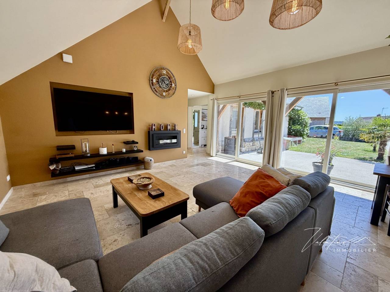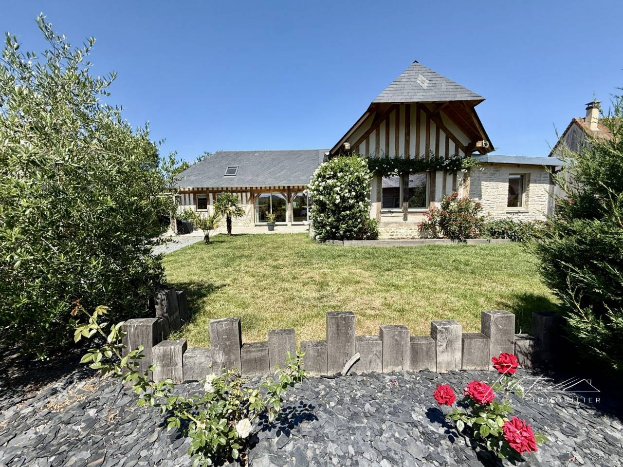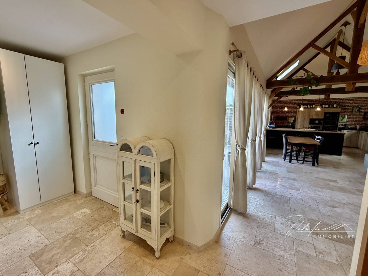 Cette maison offre un cadre de vie agréable. Dès l’entrée, vous serez séduit par une grande pièce de vie lumineuse, baignée de soleil grâce à de vastes baies vitrées orientées plein sud. Son authentique style architectural normand, rehaussé par une magnifique hauteur sous plafond et de superbes poutres apparentes dans le séjour, dégage un cachet unique, complété par une décoration moderne et chaleureuse. La cuisine ouverte, entièrement aménagée et équipée, est conçue pour un confort moderne au quotidien. L’agencement comprend également une buanderie et quatre chambres. Parmi elles, une spacieuse suite parentale de 27m², dotée d’une salle de douche à l’italienne, d’un dressing et de WC. Un couloir dessert, les chambres, des WC séparés et une salle de bains supplémentaire.