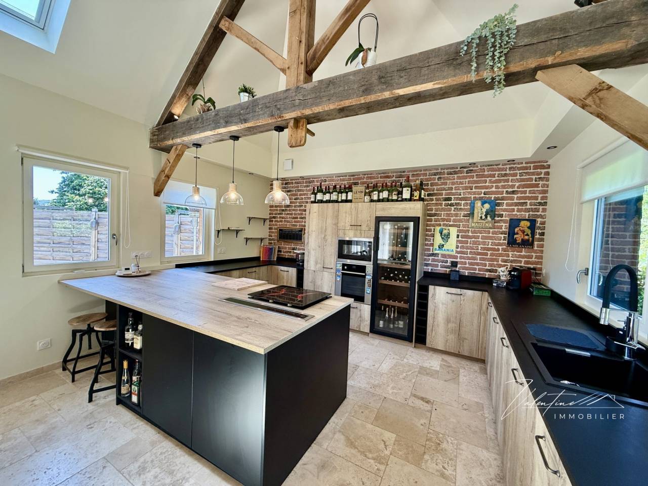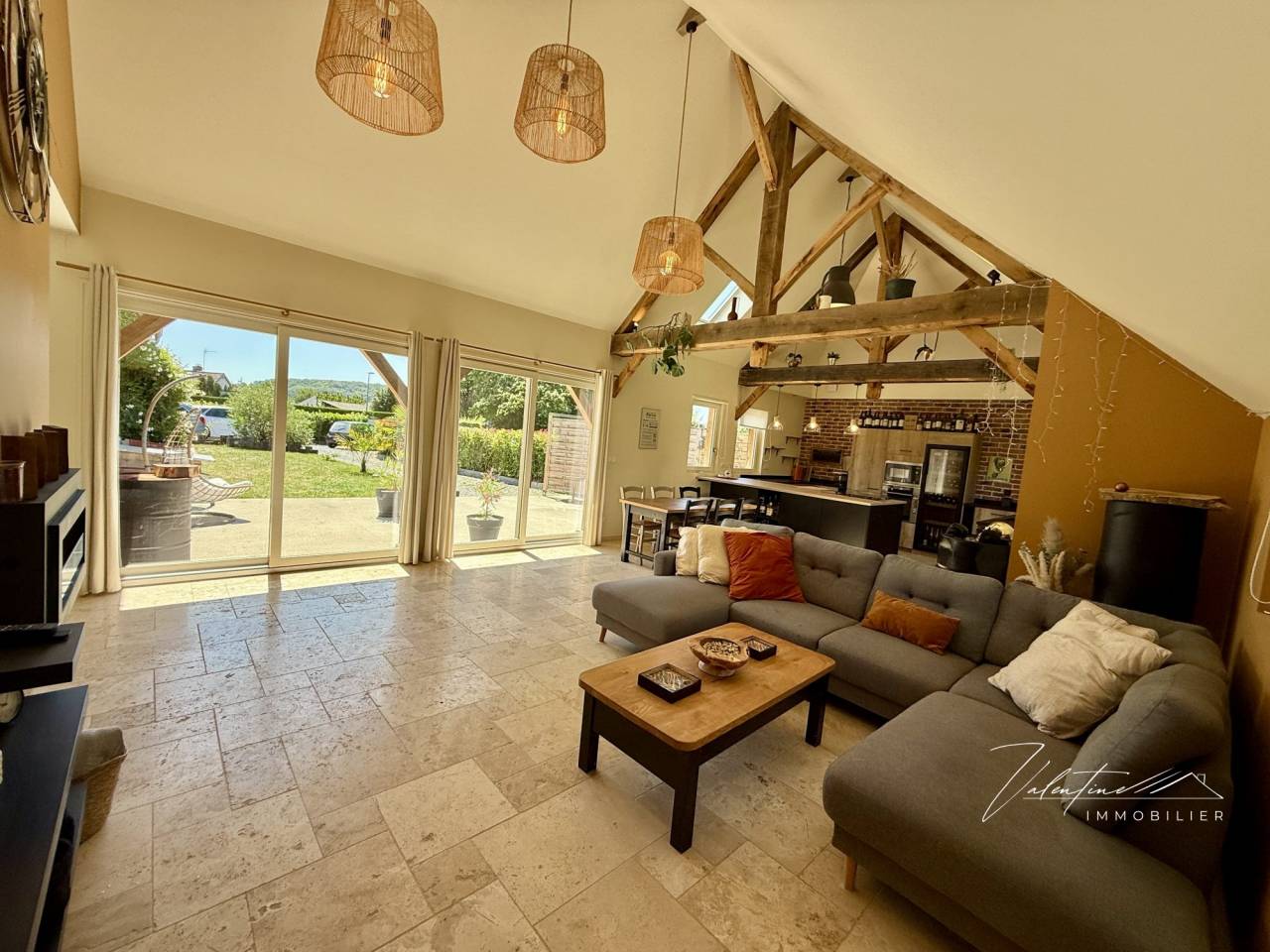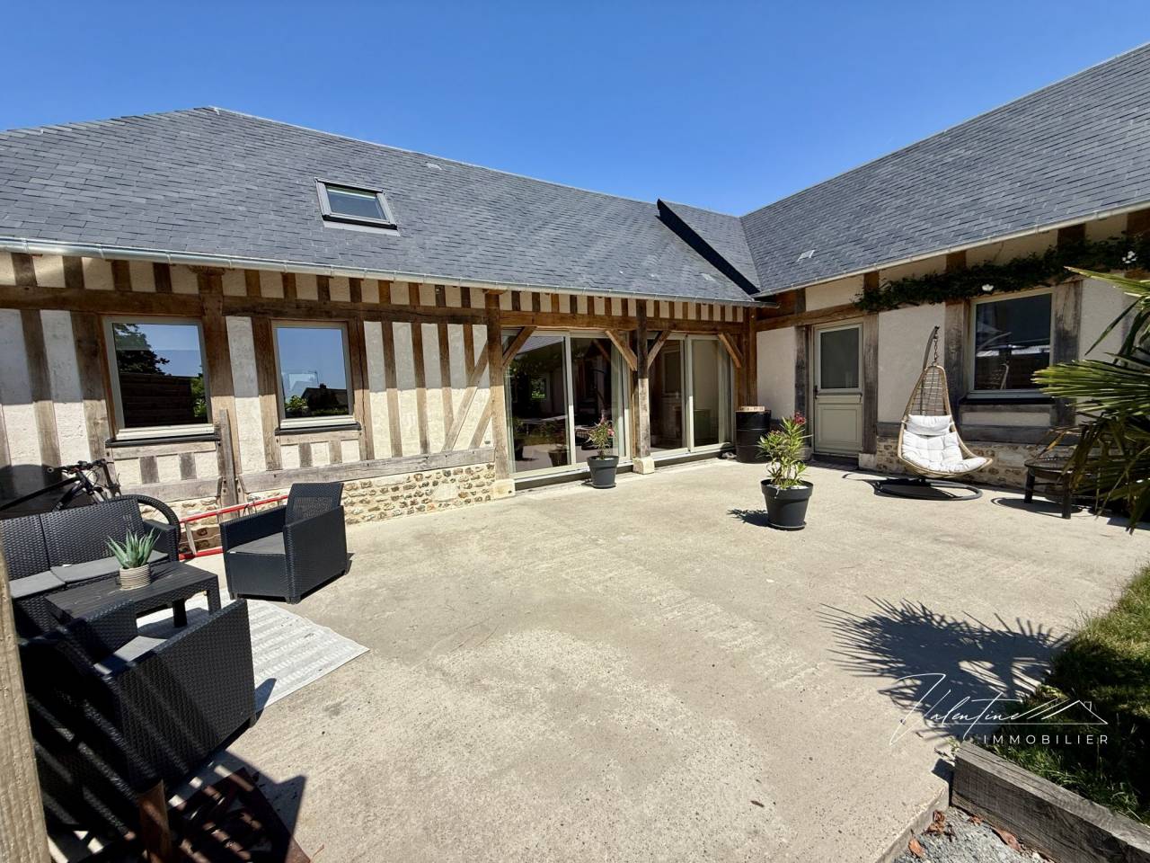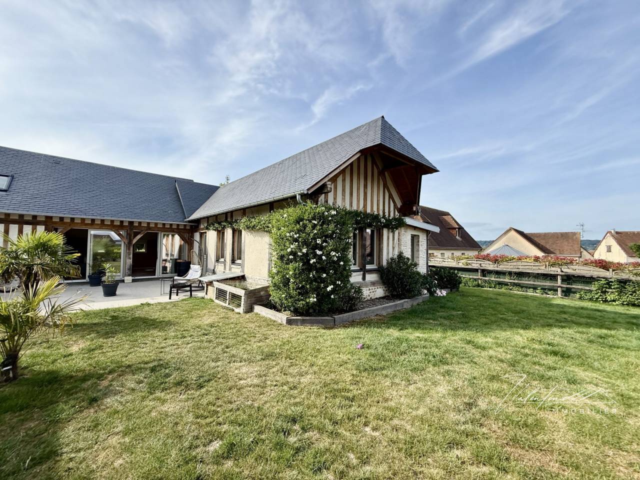 Cette maison offre un cadre de vie agréable. Dès l’entrée, vous serez séduit par une grande pièce de vie lumineuse, baignée de soleil grâce à de vastes baies vitrées orientées plein sud. Son authentique style architectural normand, rehaussé par une magnifique hauteur sous plafond et de superbes poutres apparentes dans le séjour, dégage un cachet unique, complété par une décoration moderne et chaleureuse. La cuisine ouverte, entièrement aménagée et équipée, est conçue pour un confort moderne au quotidien. L’agencement comprend également une buanderie et quatre chambres. Parmi elles, une spacieuse suite parentale de 27m², dotée d’une salle de douche à l’italienne, d’un dressing et de WC. Un couloir dessert, les chambres, des WC séparés et une salle de bains supplémentaire.