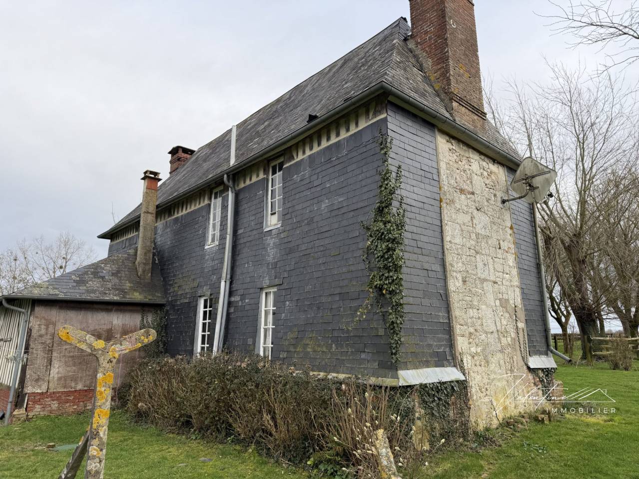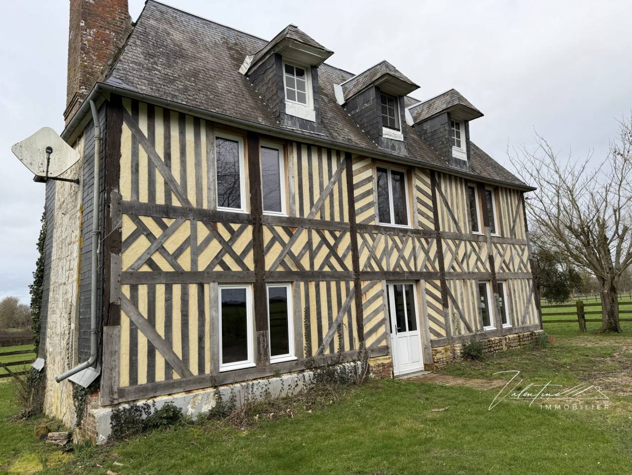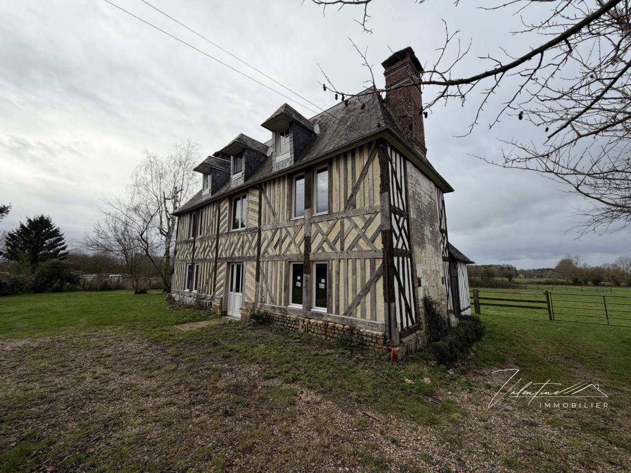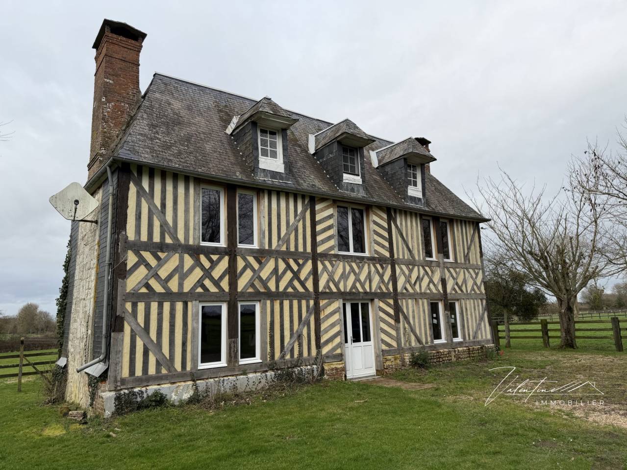 Il dispose d’un ravissant petit Manoir du XVII° en colombages couvert d’ardoises dont tous les beaux éléments d’architecture ont été conservés grâce à la volonté de ses propriétaires : ses cheminées typiques du Pays-d ‘Auge, ses tomettes, son escalier, ses portes, ses colombages. La façade a été entièrement refaite (soles et colombes en chêne chevillées, huisseries)