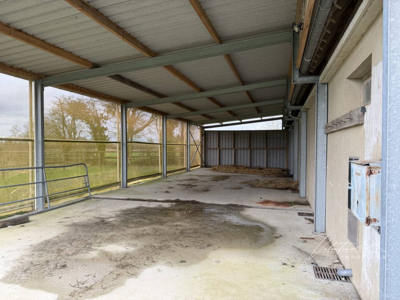 À l’arrière, un appentis entièrement refait (dalle béton, couverture bacacier anti-goutte et filets brise-vent) permet de stocker le fourrage.
